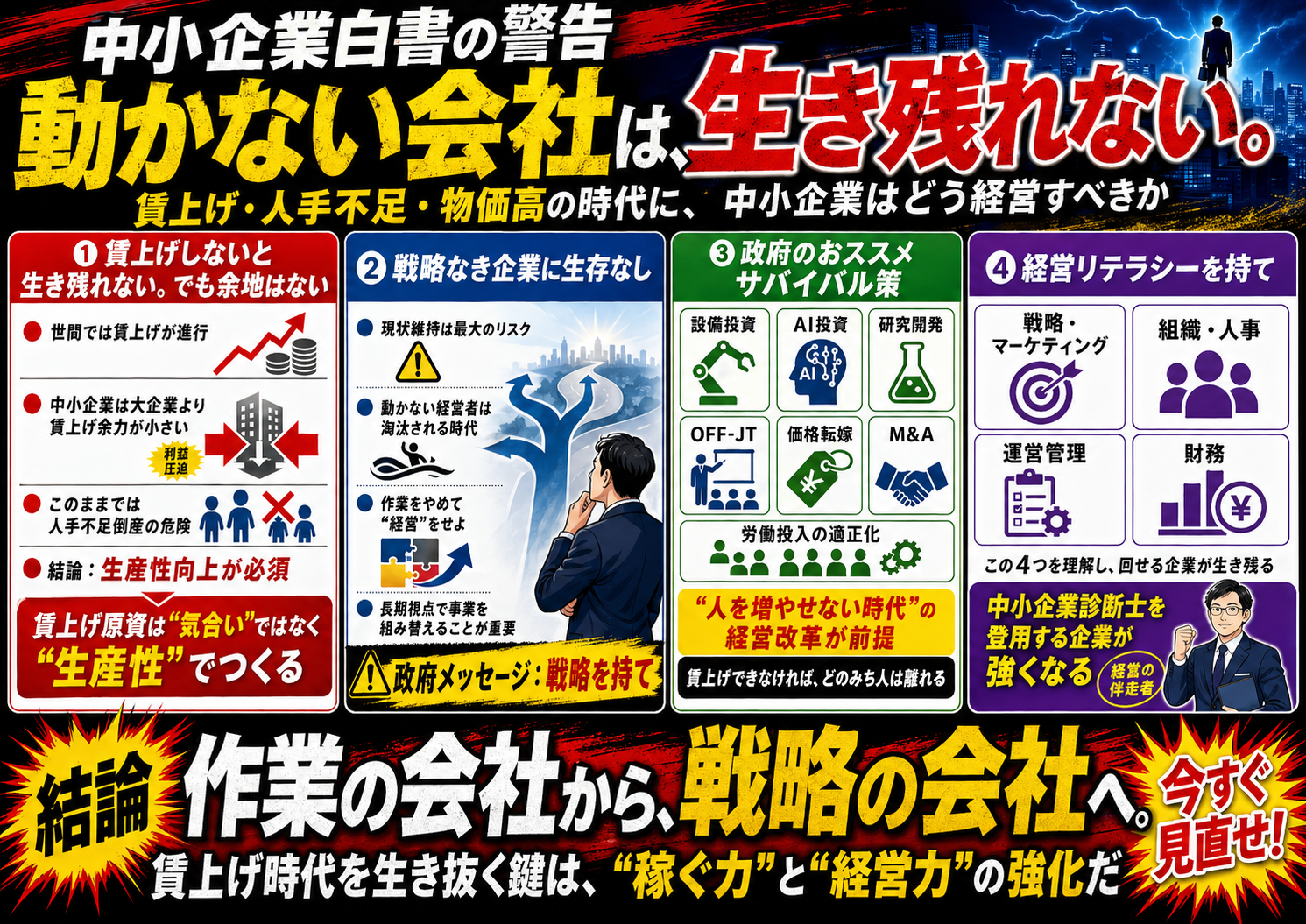 こうした時代に動かない経営者は淘汰されるのみ。戦略なき企業に生存なしという厳しい政府方針が突き付けられました。皆さん作業をやめて経営をやりましょう。